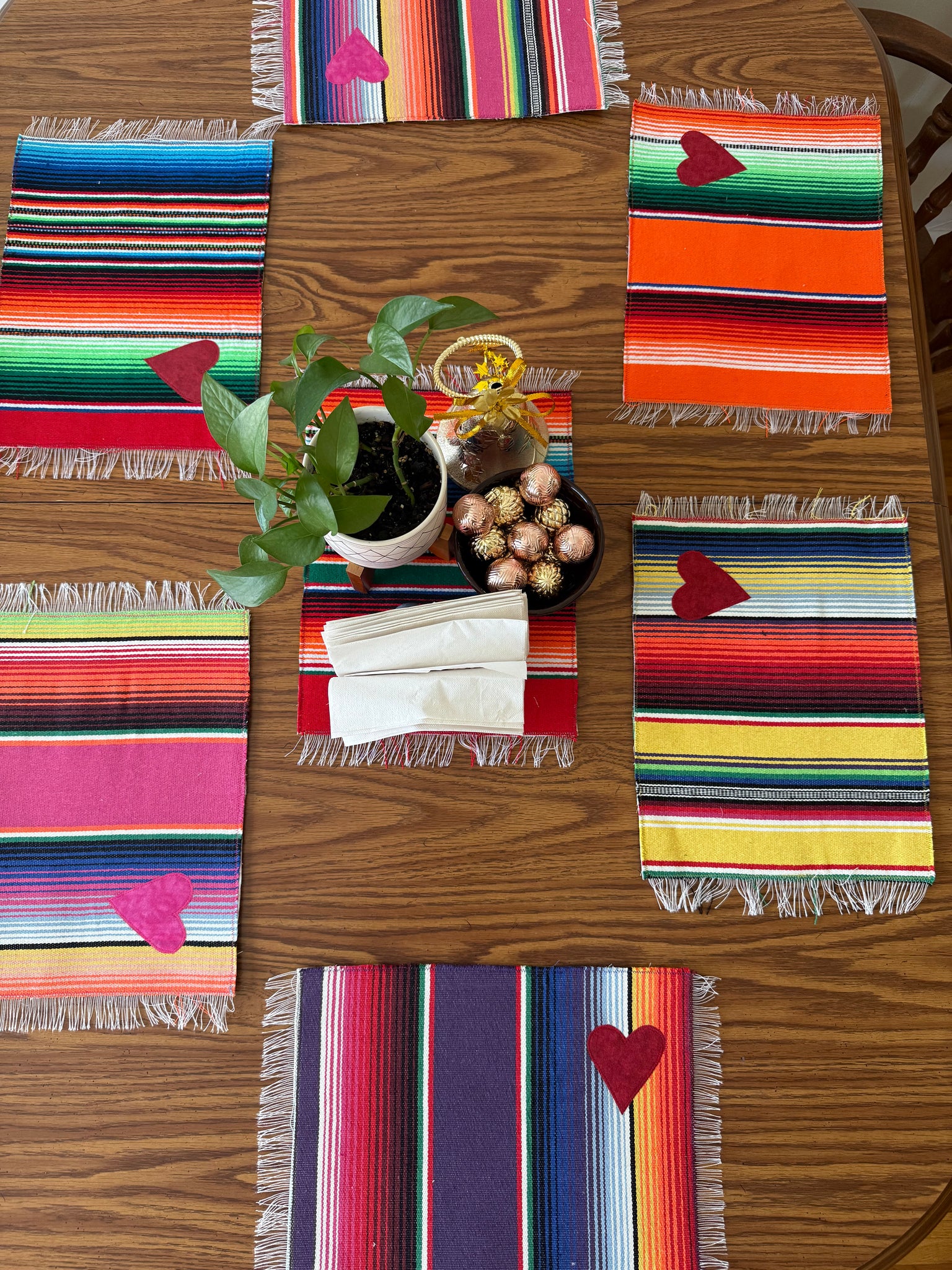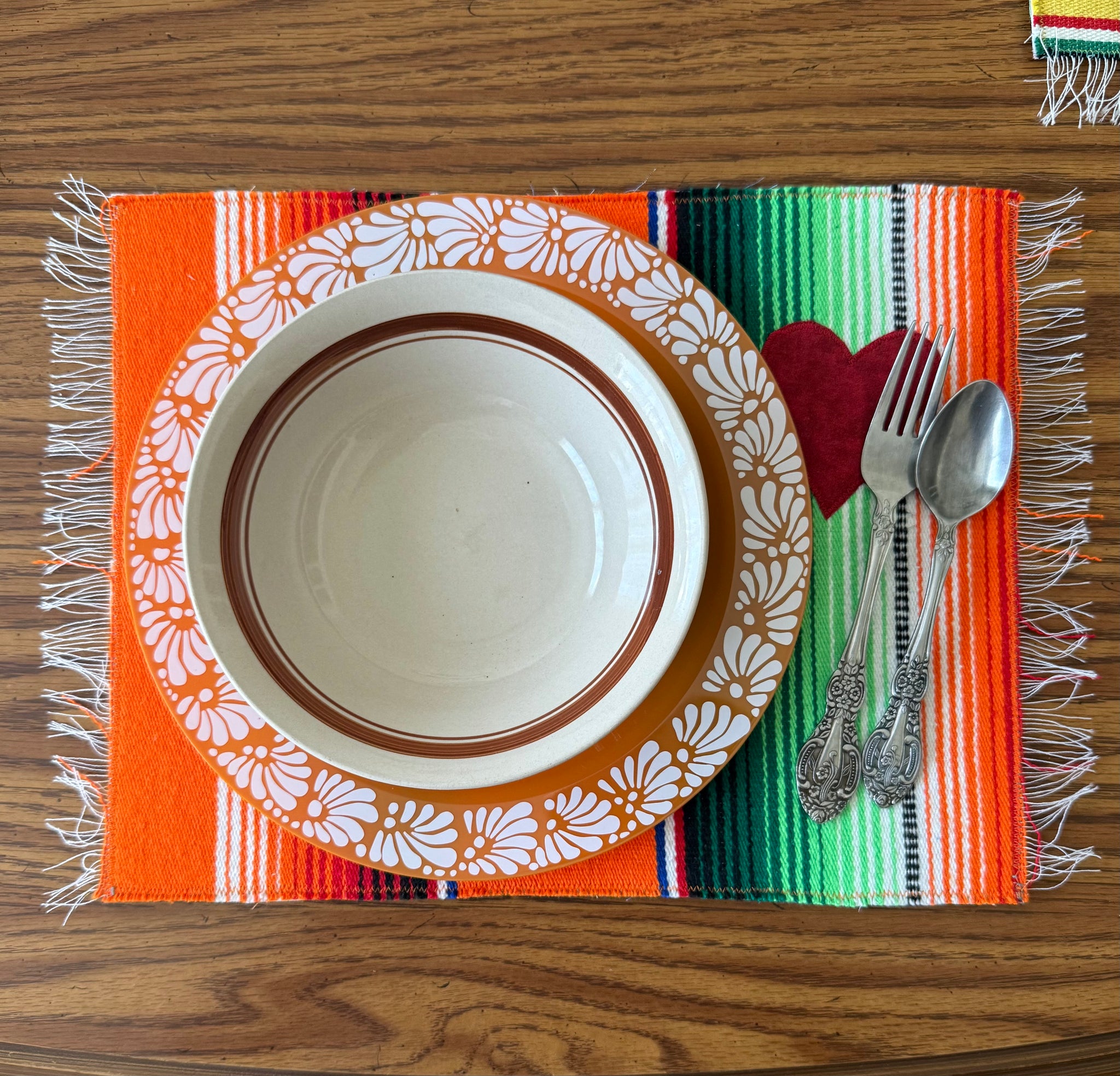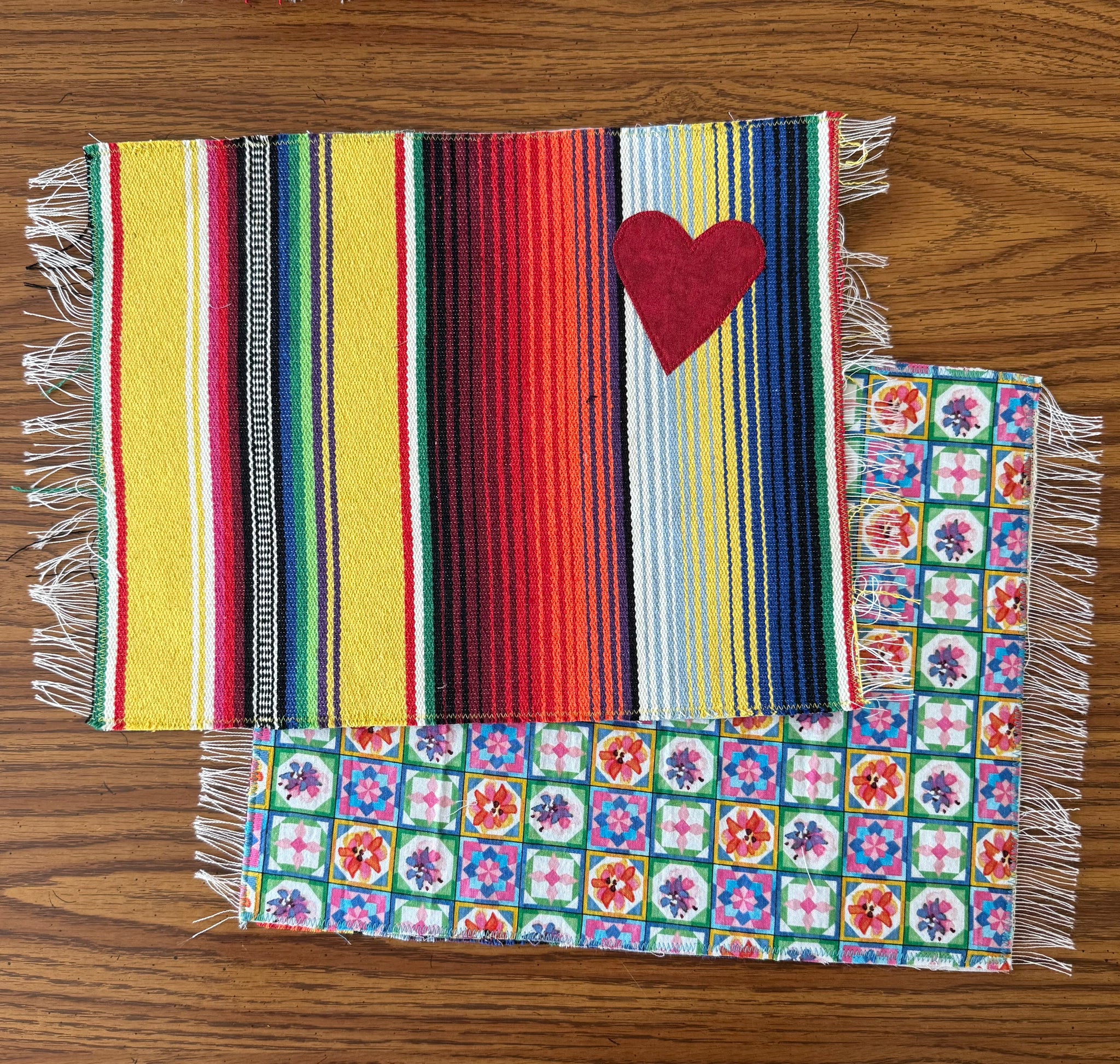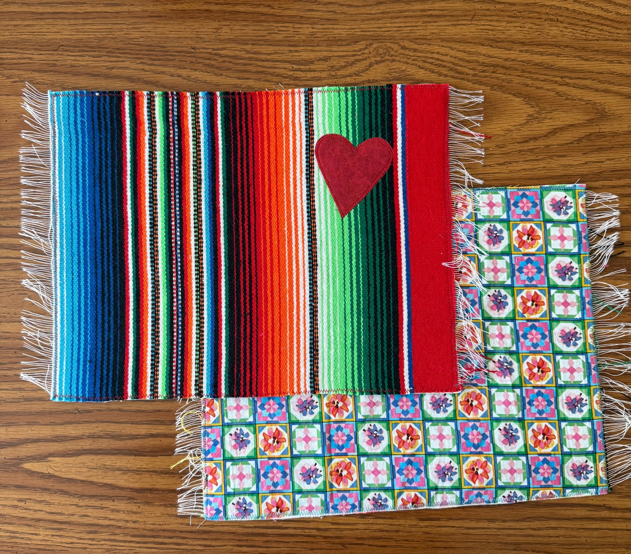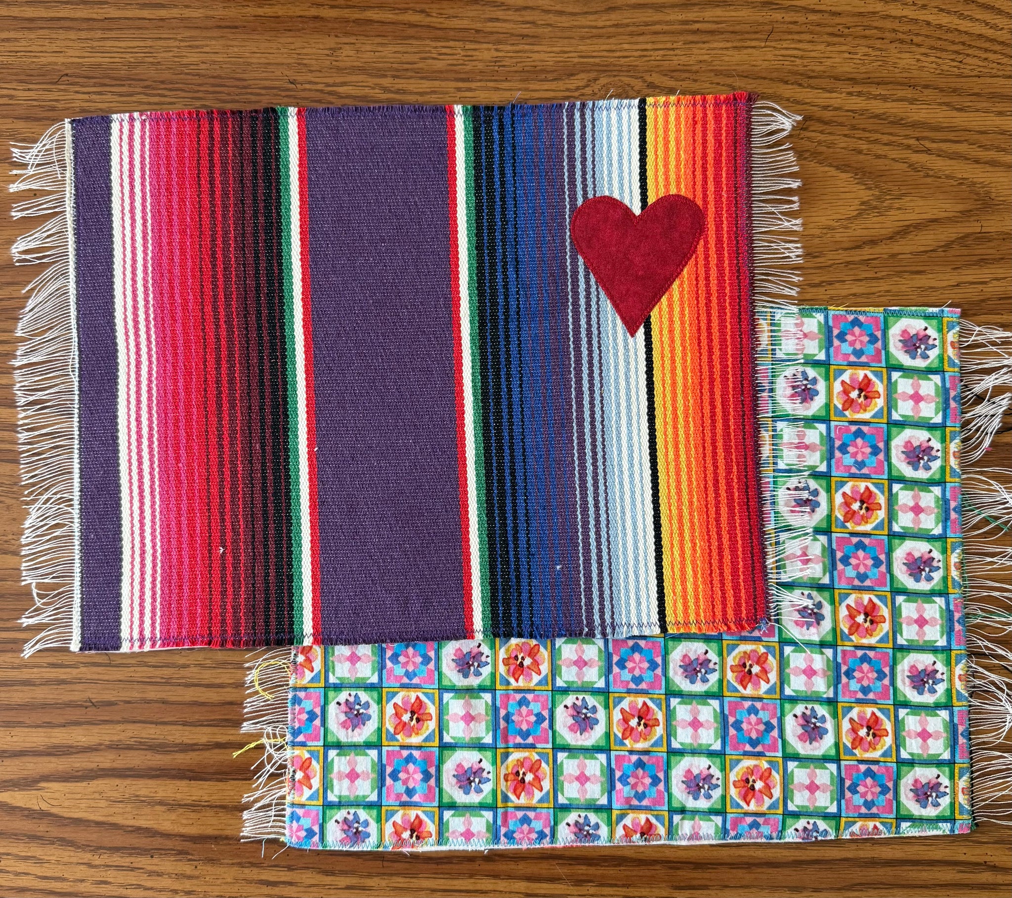 Placemat is reversible. Handmade with  sarape and stitched  heart on one side and a cotton fabric print on the other. Each one is individually handmade but the perfect imperfections makes it unique and one of a kind.