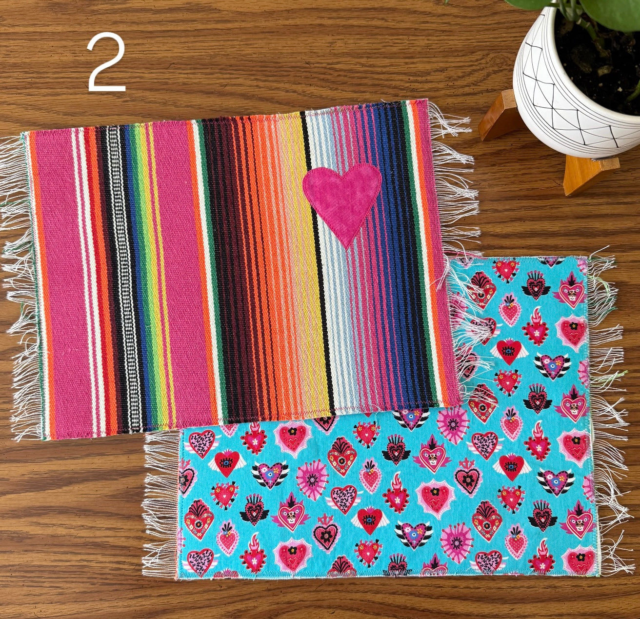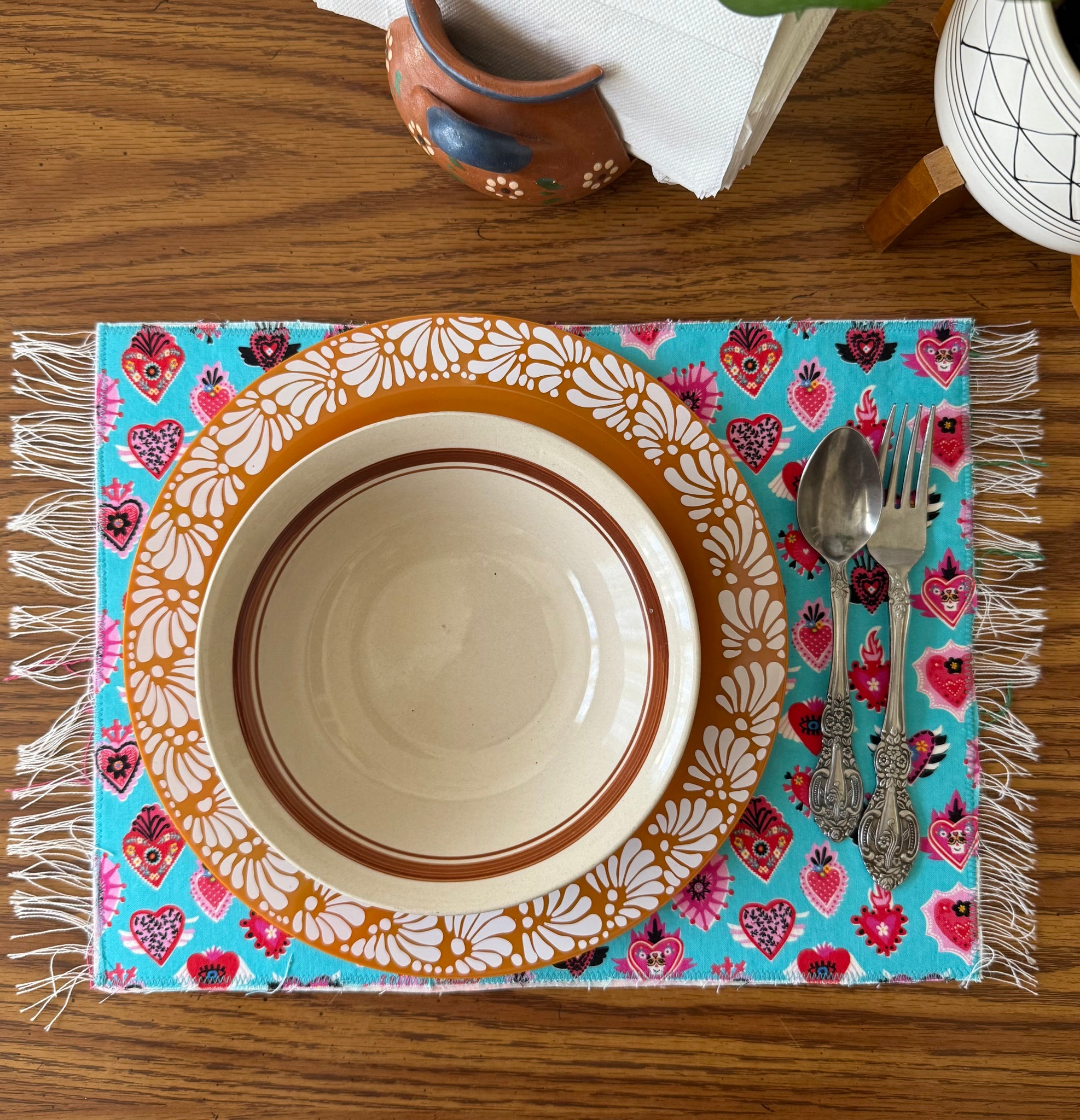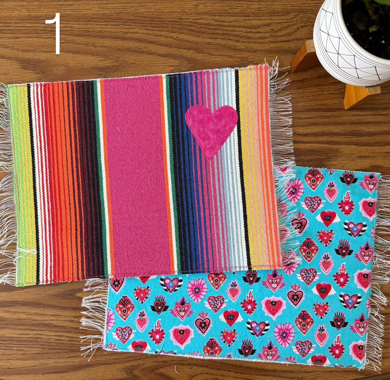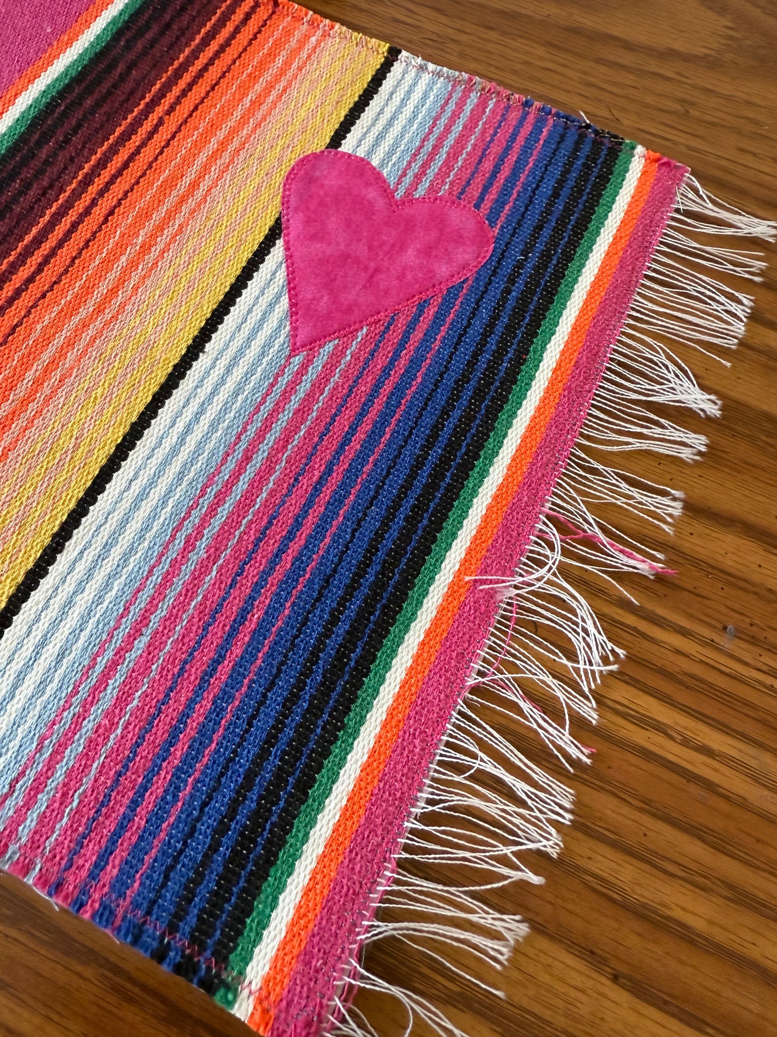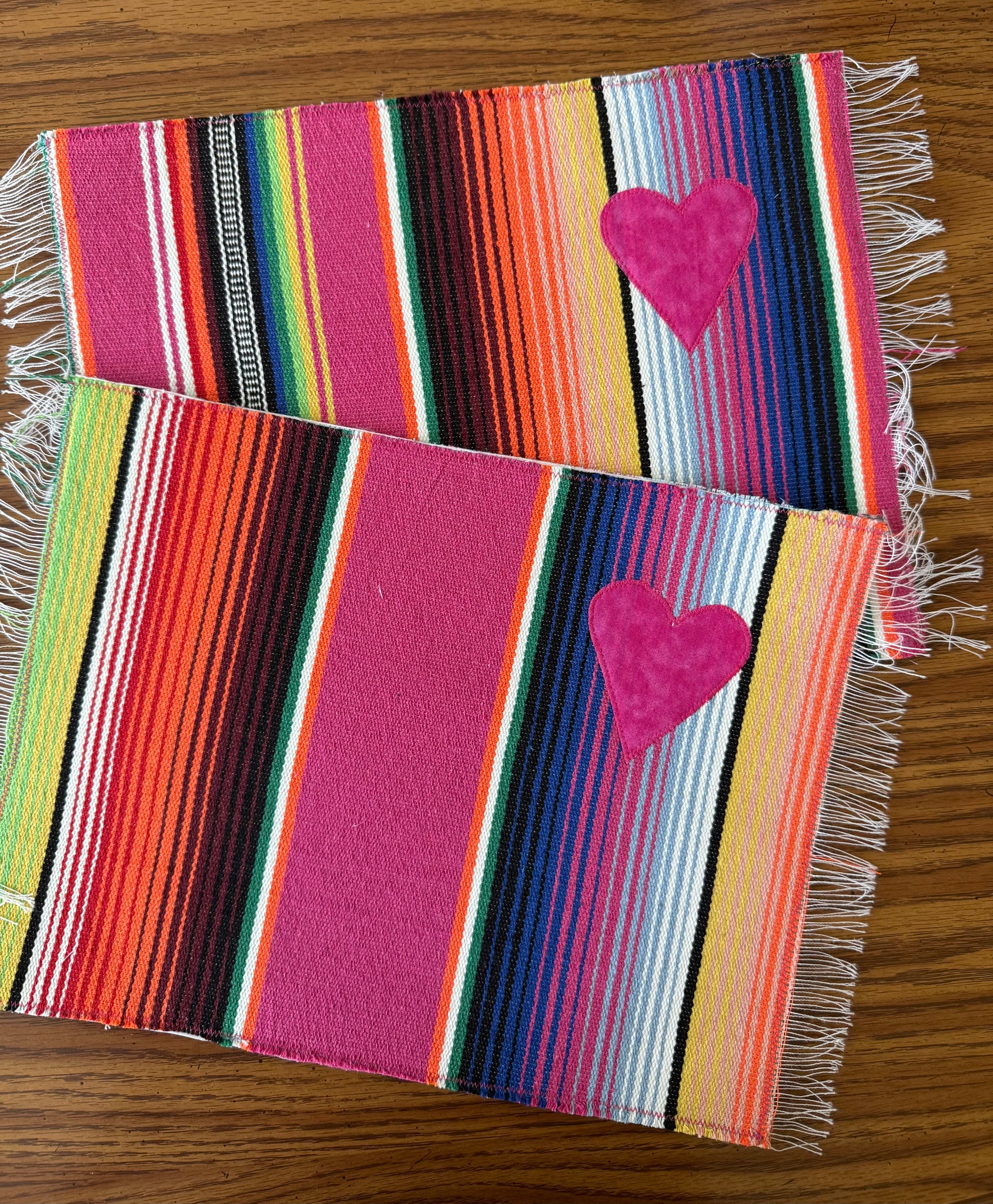 Placemat is reversible. Handmade with sarape and stitched heart on one side and a cotton fabric print on the other. Each one is individually handmade but the perfect imperfections makes it unique and one of a kind.